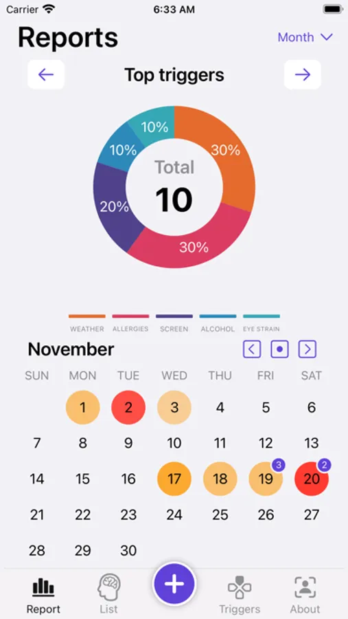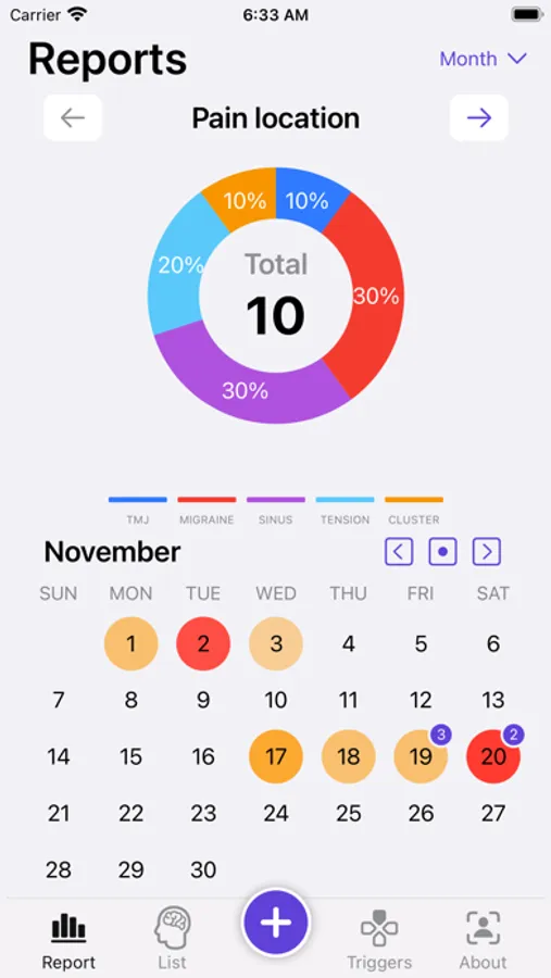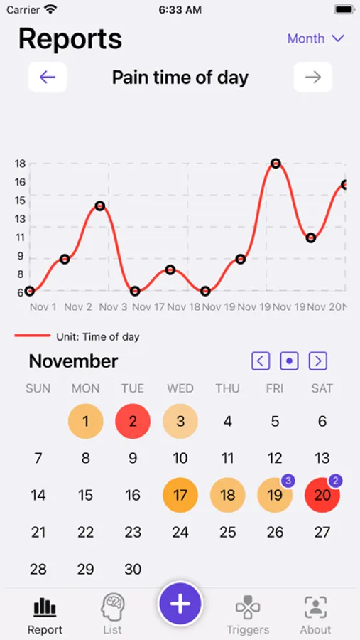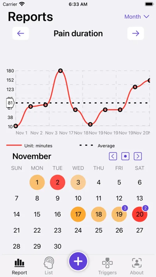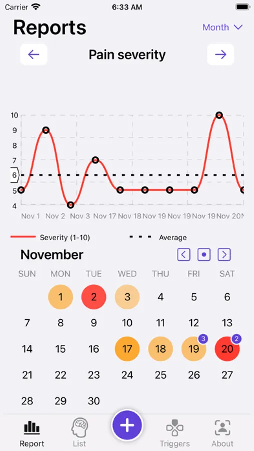 - Detailed report of a specified time period that includes triggers, location and pain severity, suitable for specific analysis.