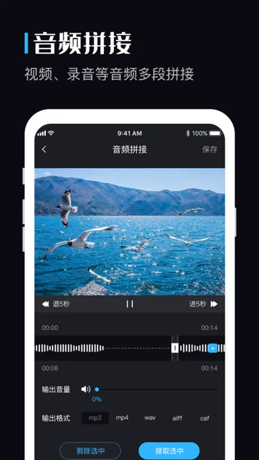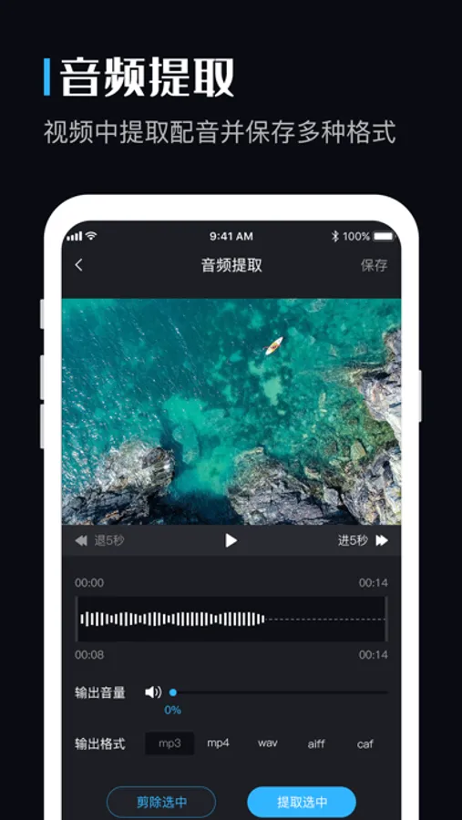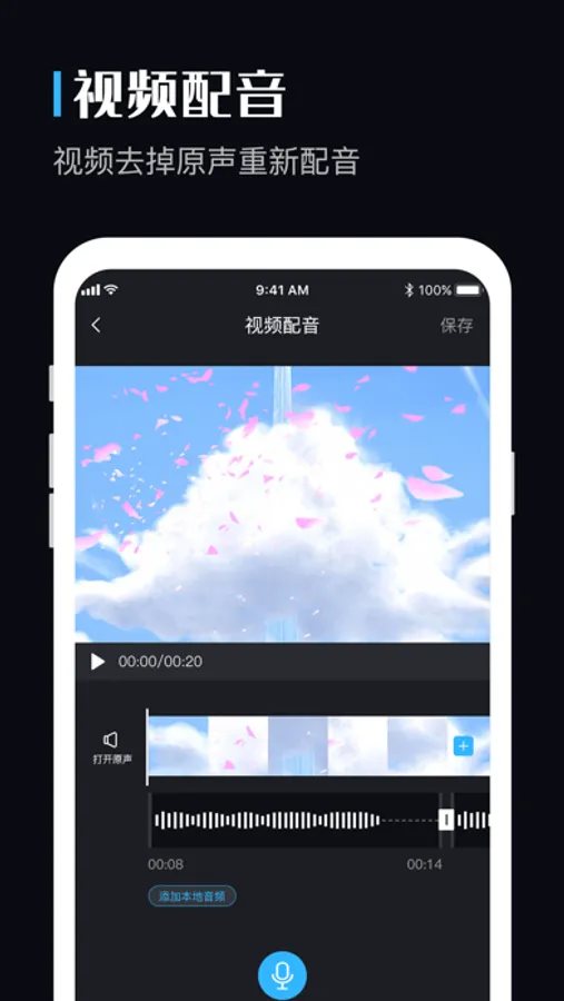 视频配音:选取视频,消除视频中的原音频,支持添加新的音频文件。