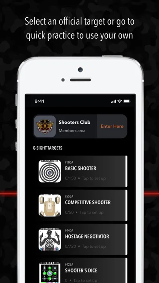 The G-Sight Shooters Club Mobile Application takes dry-fire training to the next level, allowing you to safely train when you can't get to the shooting range. This app will record your laser shots so you can review your performance and improve your technique. You can use g-sight targets for different missions and automatic scoring, or go to quick practice to use your favorite paper targets.