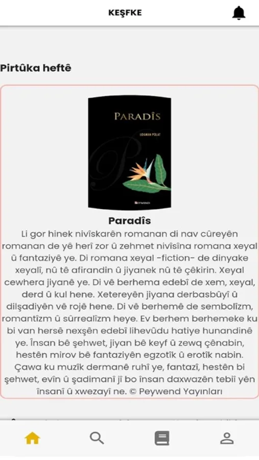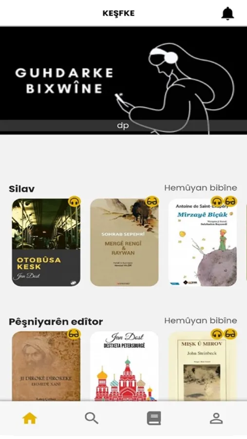 Bi vê sepanê gencîneyeke pirtûkan bi abonetiyên salane û mehane digihîne ber destê te. Tu dikarî bi telefona xwe, xwe bigihînî e-pirtûkan. Di heman demê de pirtûkan him bixwînin him jî pirtûkxaneyeke dijîtal ji xwe re ava bikî.
