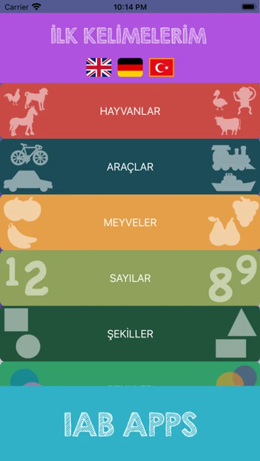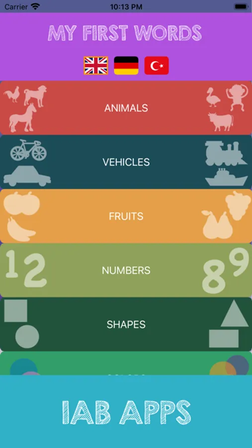 There are many phrases in My First Words app. Colors, Shapes, Animals, Numbers, Vehicles and Fruits! Your baby will learn new words very easily, both visually with catchy drawings and with sounds. Turkish, English and German.