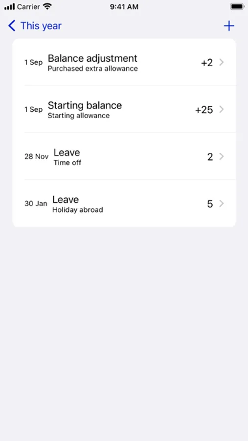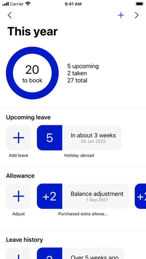 Add your starting allowance and any balance adjustments, then add your leave as you book it. The app lets you see how much leave you have left to book, and keep track of what you have planned.