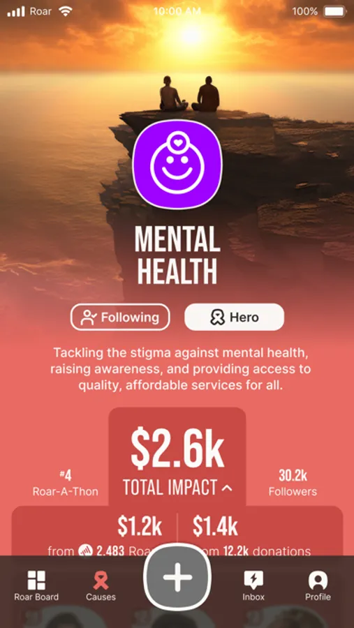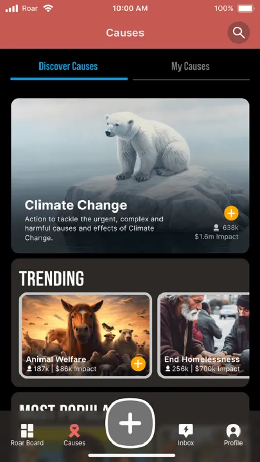 - CAUSE PROFILE: Users can learn more about a cause, and follow the cause. Users can learn which 501(c)(3) organizations benefit from each cause. This section will feature top supporters associated with the cause. It will also feature Roar Social’s total platform-wide impact on the cause.