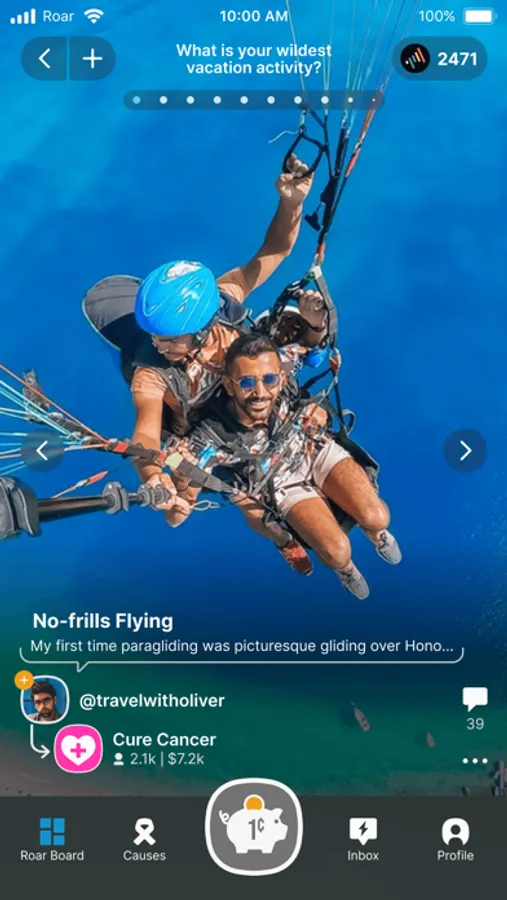 - MICRO-DONATIONS: When a user likes a post, they can tap “Penny” the Pig and donate 1 cent to that creator’s Hero Cause. If they LOVE a post, they can tap and hold to donate even more. Proceeds go to established and vetted 501(c)(3) organizations that are listed on each Cause Profile. Roar Social keeps $0 of user donations.
