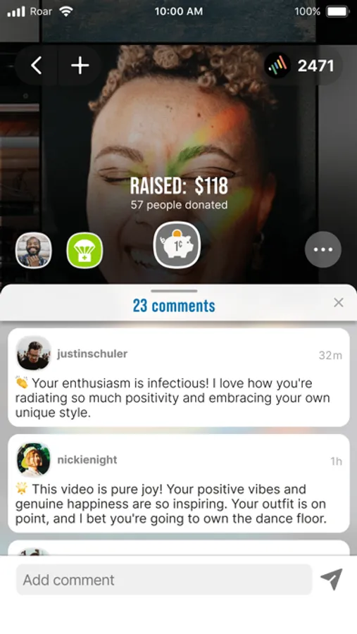- ROAR GIVING WALLET: Users can load their wallet using Apple Pay or a credit card. Once the wallet is loaded, they can seamlessly micro-donate to any post.