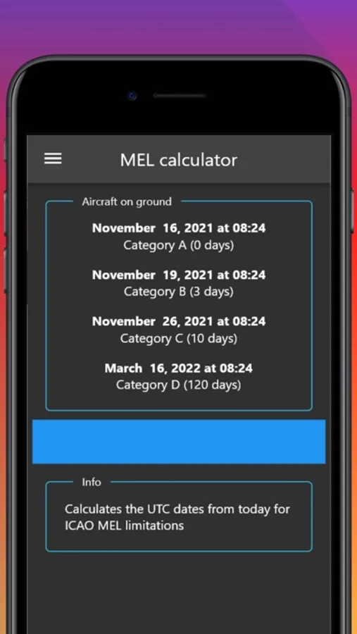 MEL calculator is a tool for the aircraft engineers. Its calculates the expire date (a,b,c,d category) of defected airplanes.
