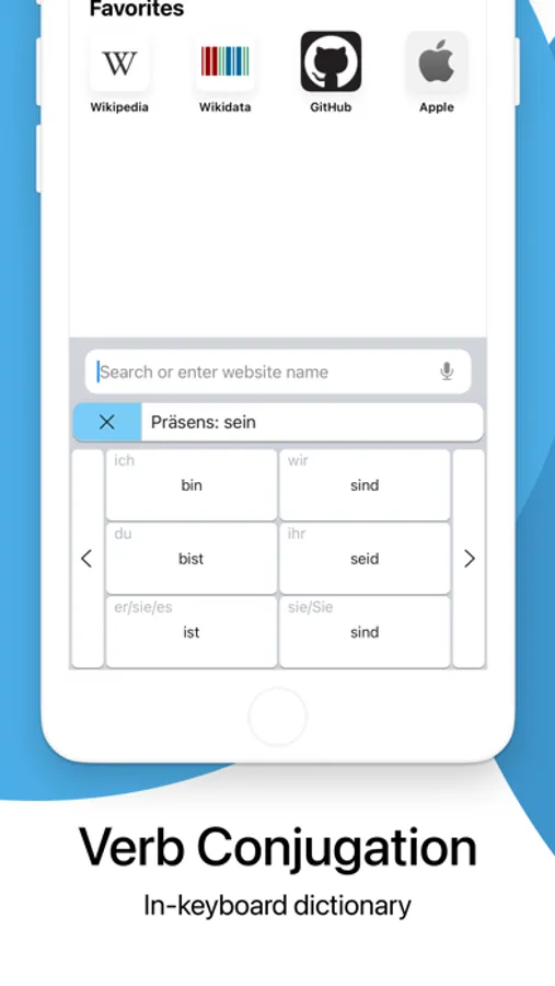 - With the Conjugate feature, a user is presented with the grammar charts for an entered verb instead of the keyboard. Pressing an example in the charts inserts the chosen conjugation into the text field.