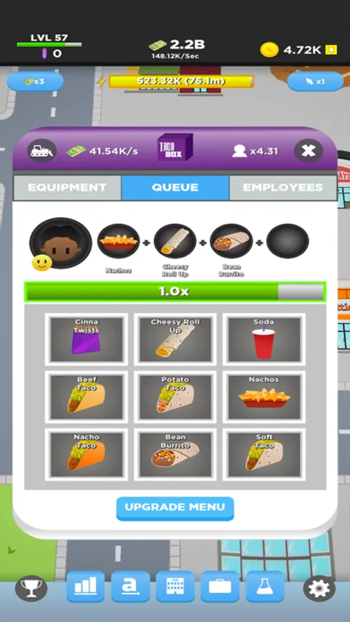 Start small and grow by upgrading equipment and researching new menu items to increase profitability! Complete customer orders yourself or hire employees and make them do all the work. They will still look to you to deal with customer complaints and handle workplace accidents. Purchase employee perks to hire better employees, increase employee levels to allow you to run your franchises more hands off.