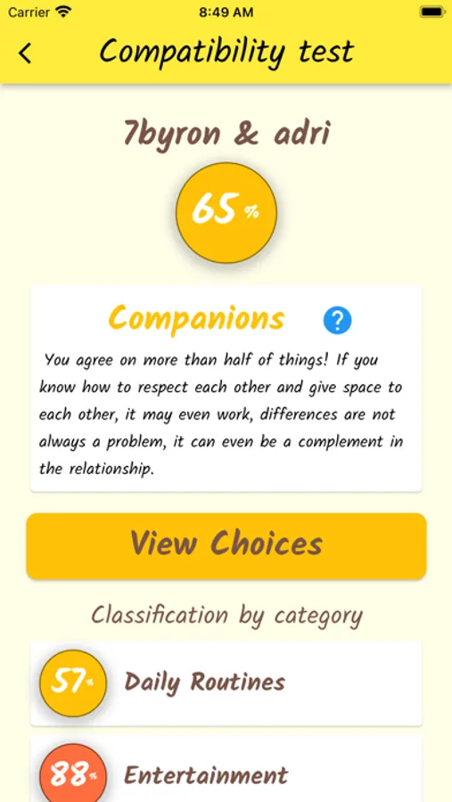 Compare your test with your friend, partner, spouse, son, father, mother, boss, teacher... with whoever you want! And find out how compatible you two are :)
