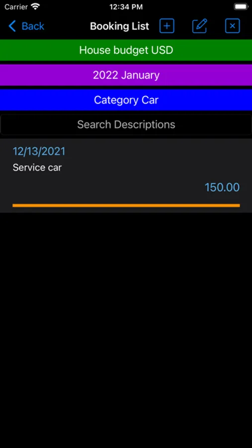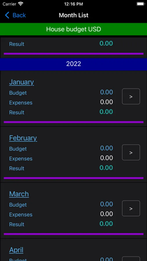 Before you capture the first entries in a category and set the budget for the category, the totals equals zero in all financial levels. After capturing, you have always the Total of the Budget, the Total of the entries expense values and the Difference. When the result equals 0 or plus, the value is showed in green color, otherwise in red.