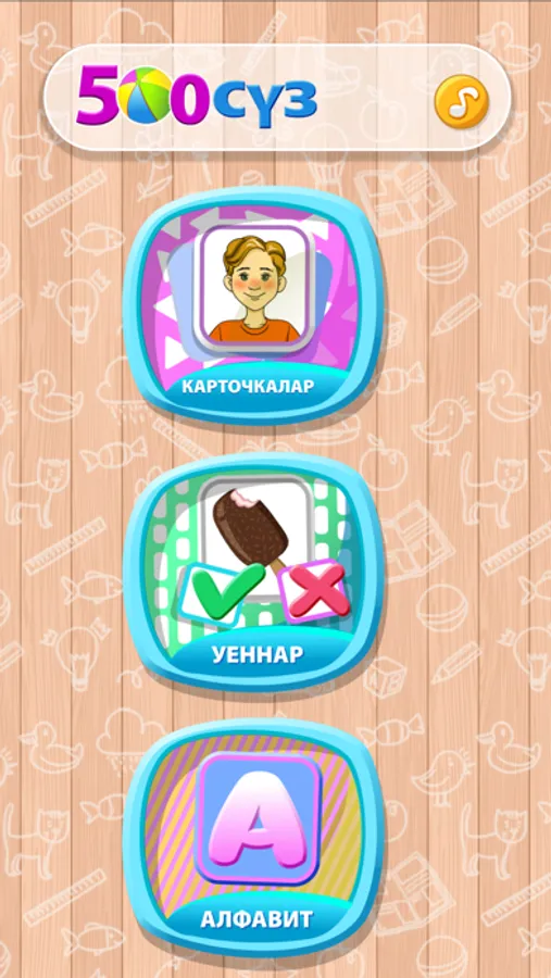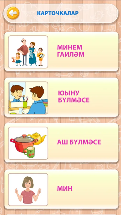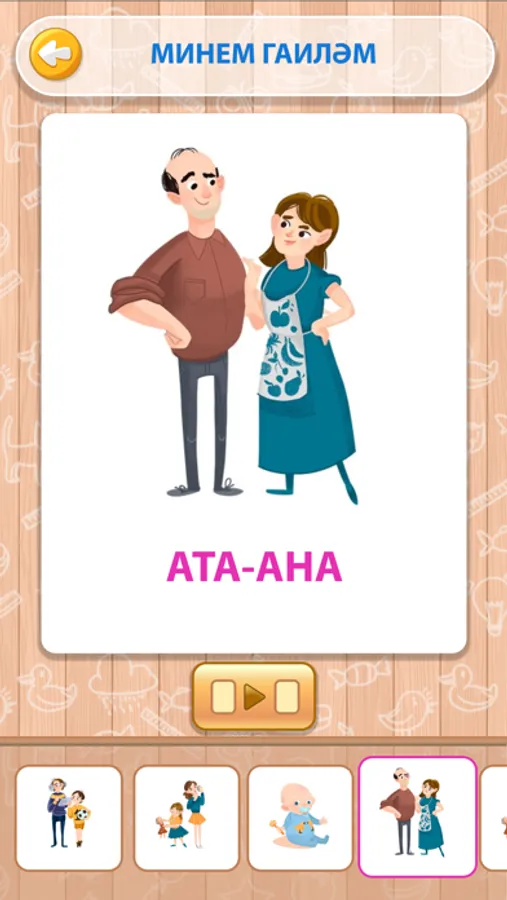 «500 татарских слов» – это приложение, где собраны самые активные слова татарского языка, которые разделены по таким темам, как «Я», «Моя семья», «Моя одежда», «Животные», «Растения» и.д. В приложении 3 раздела: алфавит, карточки и игры. В разделе «Алфавит» вы сможете познакомиться с буквами татарского алфавита. А в разделе «Карточки» вас ждут много слов, которые разделены по темам. Красочные рисунки, произношение и написание слов помогут вам быстро выучить и запомнить слова. А с помощью раздела «Игры» вы легко сможете закрепить полученные знания.