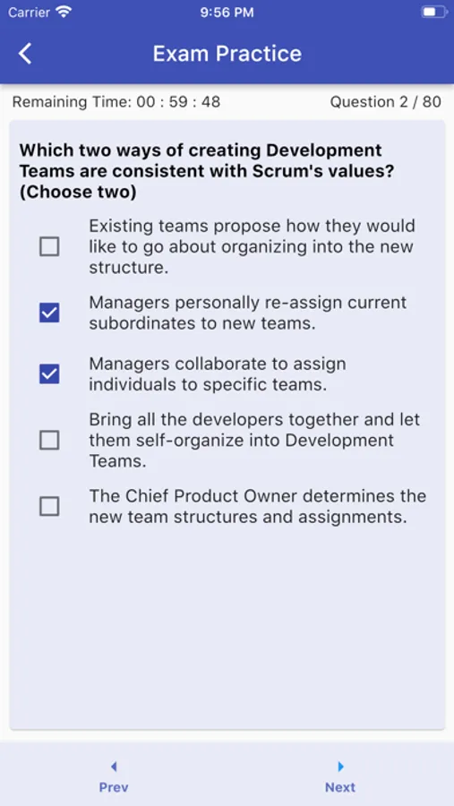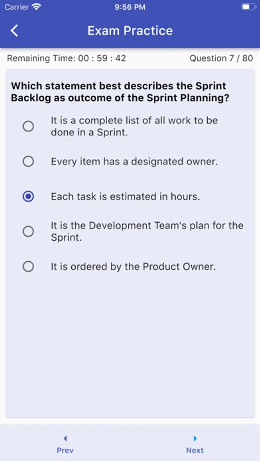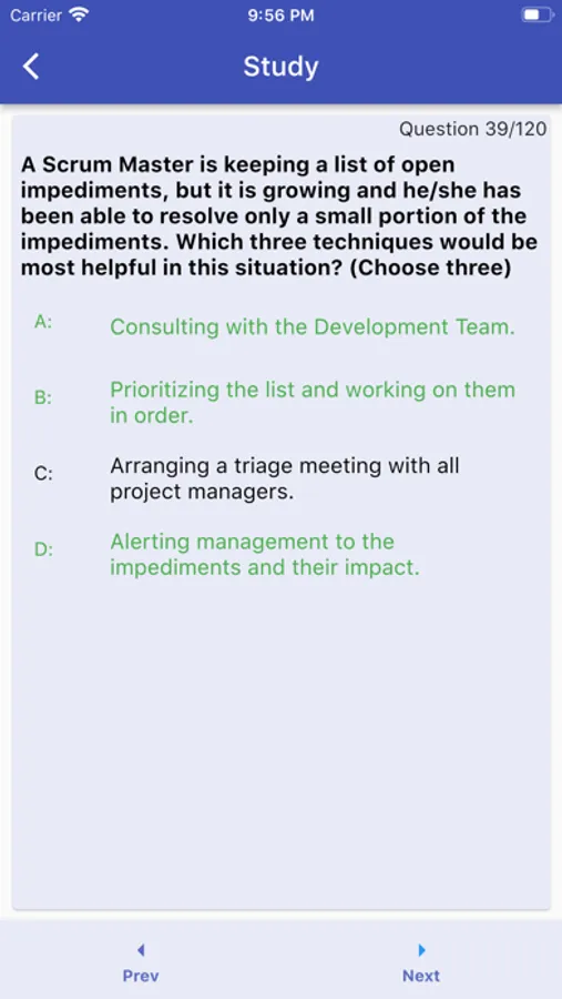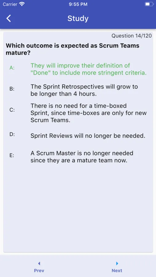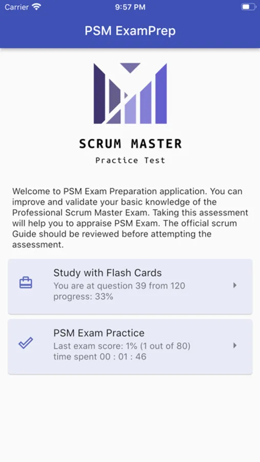 Welcome to PSM Exam Preparation application. You can improve and validate your basic knowledge of the Professional Scrum Master Exam. Taking this assessment will help you to appraise PSM Exam. The official scrum Guide should be reviewed before attempting the assessment.