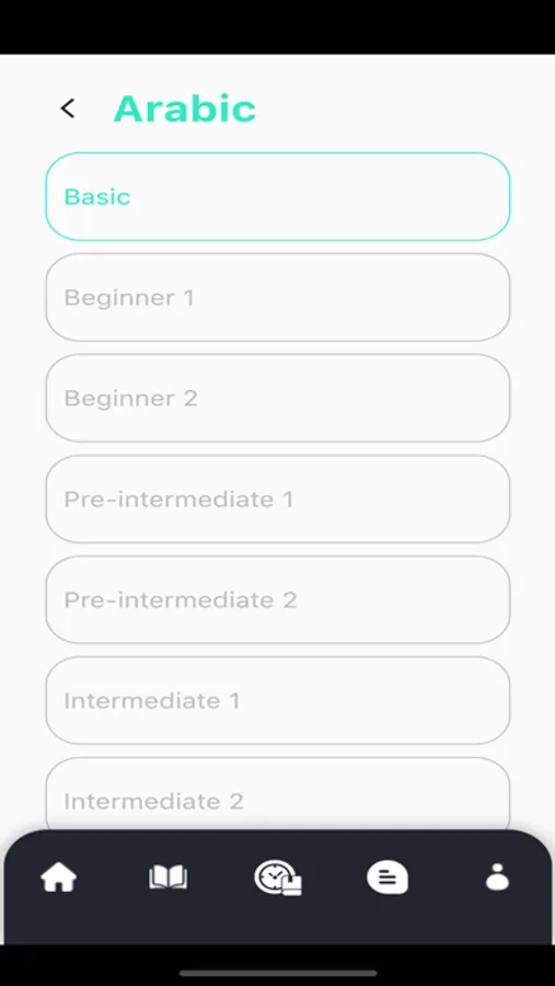Basic level, beginner level, pre-intermediate level, intermediate level, upper-intermediate level, advanced level.