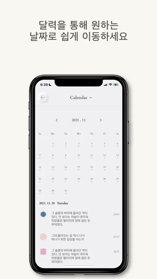 - 리스트에서는 모든 기록을 모아볼 수 있으며, 달력의 날짜를 누르면 해당 날짜로 스크롤이 이동합니다.