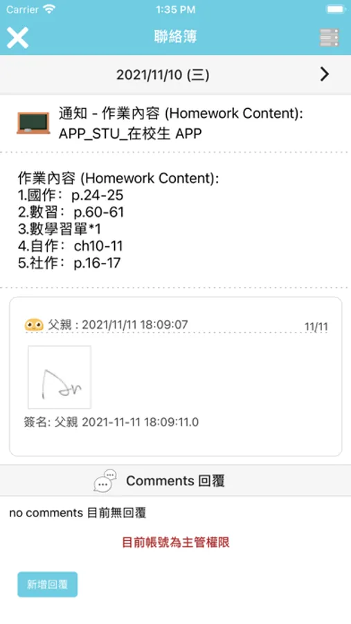 3. 聯絡簿:班級教師編輯課堂內容和作業給家長,家長可回覆與老師溝通交流。