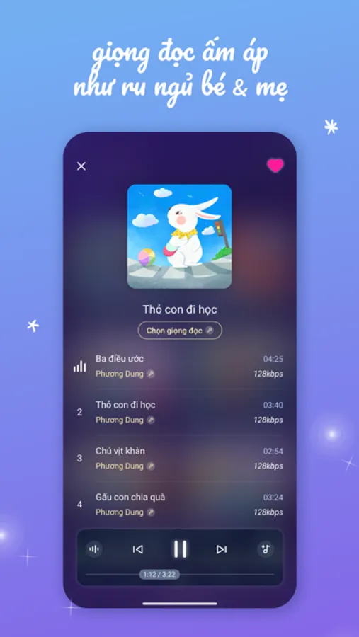 Gần 500 truyện kể với rất nhiều thể loại khác nhau được tuyển chọn/biên tập kỹ càng. Các giọng đọc truyền cảm, giàu kinh nghiệm cùng với hiệu ứng âm thanh đạt chuẩn giúp bé dễ dàng chìm vào giấc ngủ.