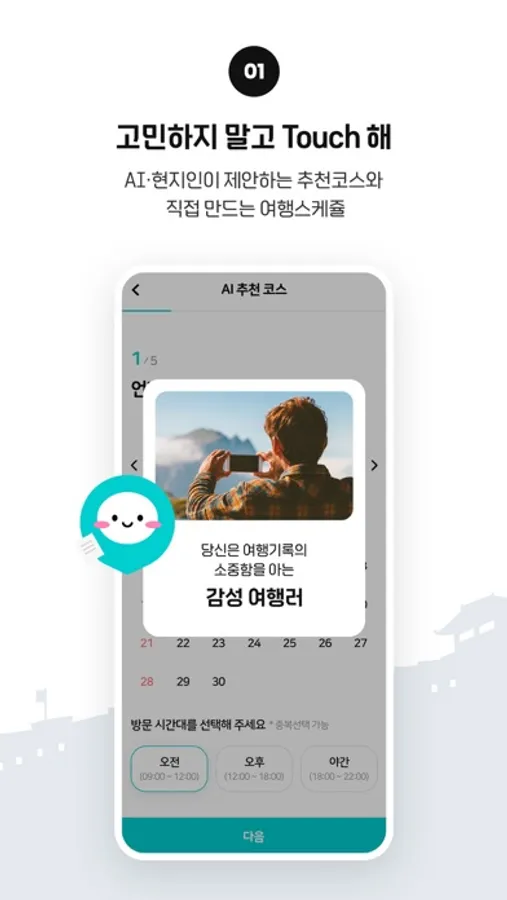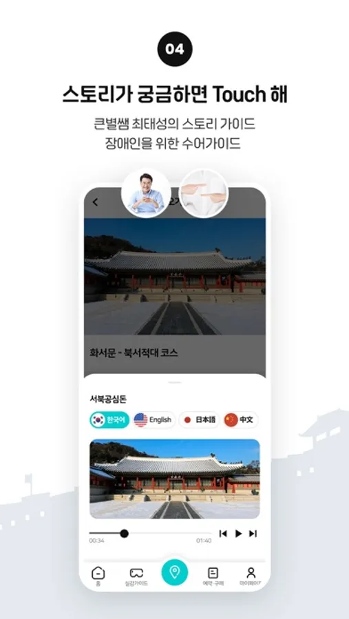 추천코스 제안과 도보 길안내서비스, AR/VR로 즐기는 실감가이드, 문화해설사와 오디오가이드, 다양한 체험상품의 예약 및 결제, 맛집·카페 픽업오더 및 상품구매, 다양한 할인혜택 등을 앱 하나로 즐기실 수 있습니다.