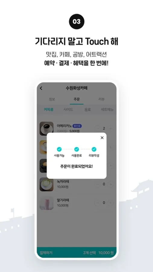 -수원화성 행리단길, 공방거리, 통닭거리 등의 100여개 맛집과 카페 상품을 모바일로 주문하고 쿠폰 등 할인혜택도 받으실 수 있습니다.