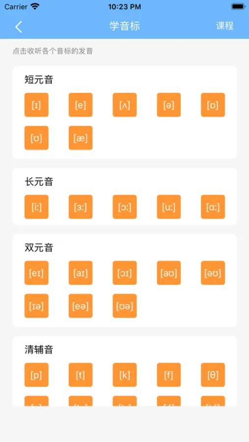 「学音标」宝宝可以自己点击48个音标学习每个音标的发音,为了更好的学习音标特地配备了每个音标发音的课程。您的宝宝可以在学习完音标发音后,通过不断免费解锁课程学习更多的音标知识。