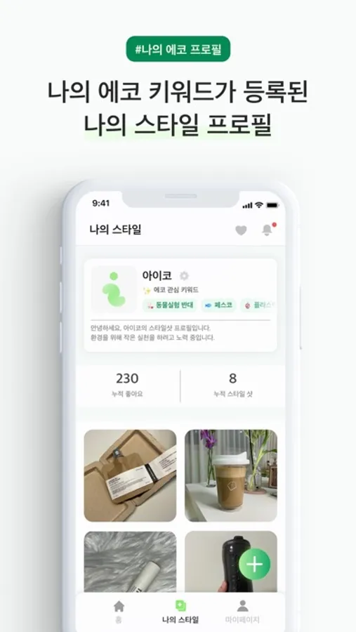 친환경 스타일샷과 친환경 상품에 대한 후기들을 공유할 수 있습니다. 또한 에코 키워드 별로 상품 혹은 스타일샷을 분류할 수 있습니다.