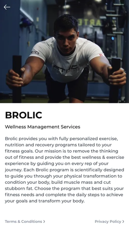 Brolic, provides you with fully personalized exercise, nutrition and recovery programs tailored to your fitness goals. Our mission is to provide the best wellness & fitness experience by guiding you through your physical transformation. Gain control of your fitness with video guided programs designed to condition your body, build muscle and cut stubborn fat. Choose the program that best suits your fitness needs and complete daily steps to achieve your goals and transform your body.