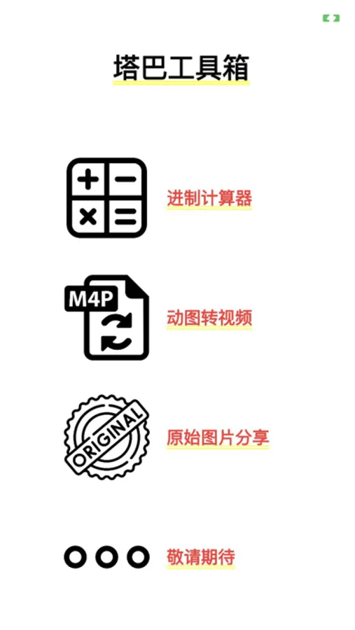塔巴工具箱包括了以下三个功能,动图转视频,大数计算器,原始图片视频分享。