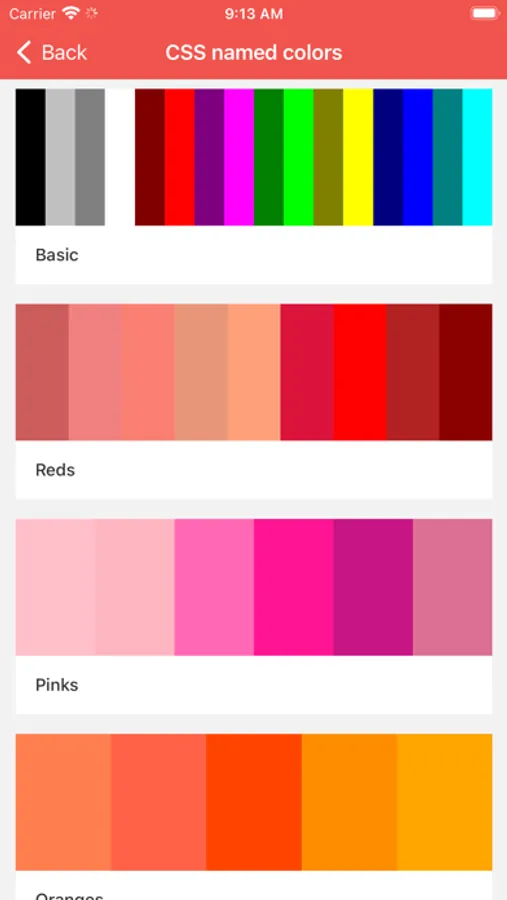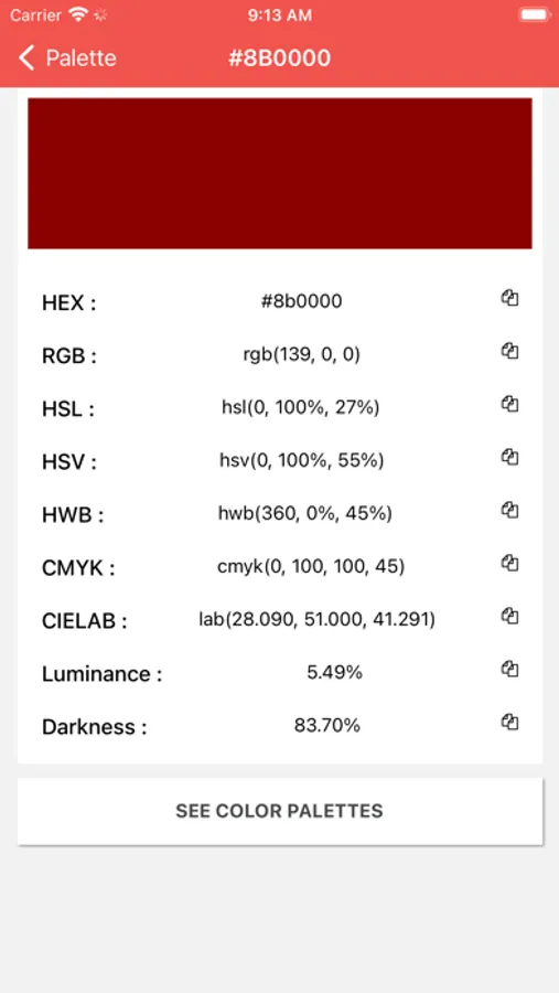 See all sorts of details about a color. Convert any color code to various color code formats easily. When adding a color, you can use any color code format including the CSS named colors. Copy the color code to your clipboard with just a tap.