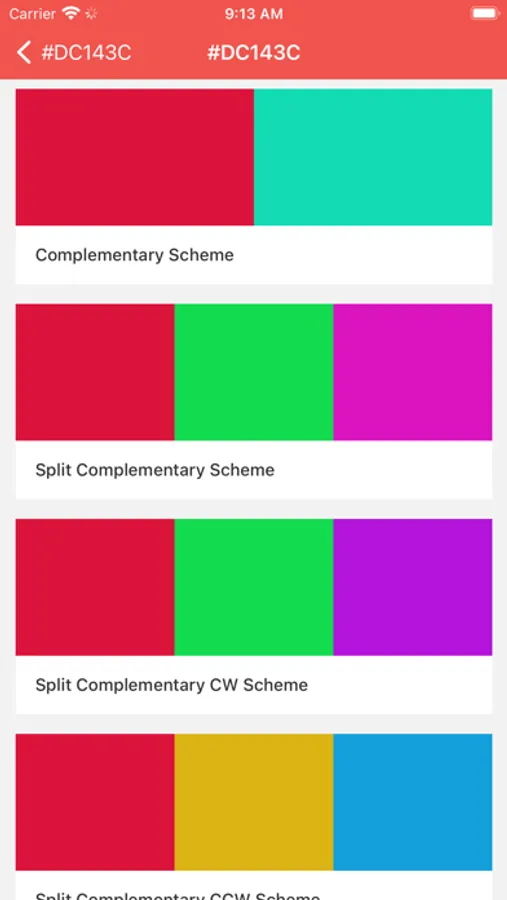 Generate harmonious color schemes from an existing color using various models such as complementary, split-complementary, triadic, tetradic, analogous, monochromatic etc. and save them to your library.
