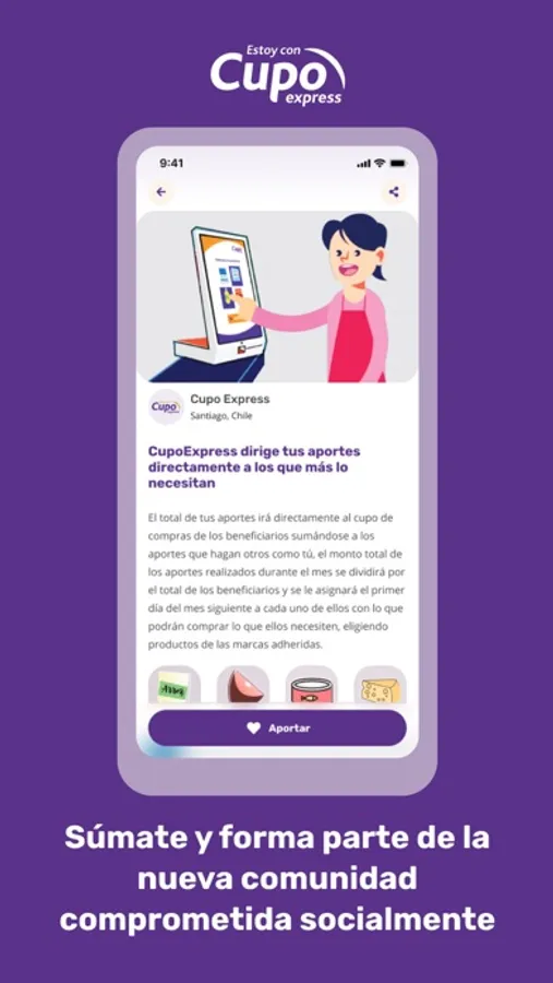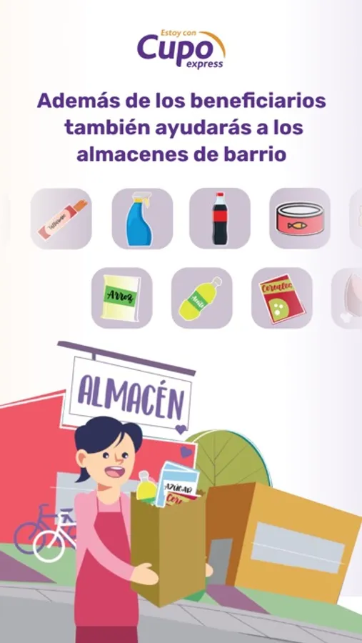 Con CupoExpress podrás realizar aportes sociales a los que más lo necesitan, de manera fácil transparente y directa, ya que siempre podrás estar seguro de que el monto que tú elijas aportar es exactamente el que les llegará a los beneficiarios, permitiéndoles a ellos realizar compras de cientos de productos de primera necesidad en los almacenes de su barrio.