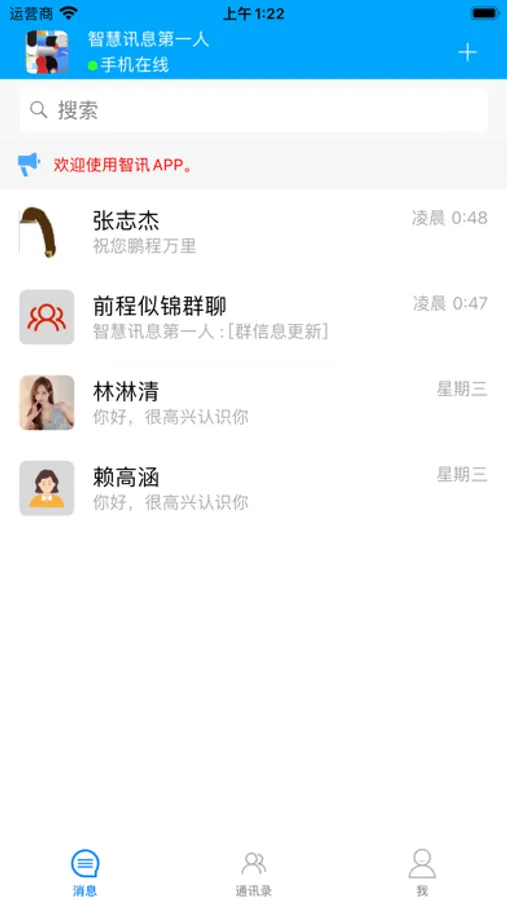 智讯APP是一款针对年轻群体设计的社交软件,画面简洁大方,扁平化设计,优化操作流程,对标主流软件,你可以通过智讯APP来认识陌生朋友,里面有丰富的表情包供您交友使用。