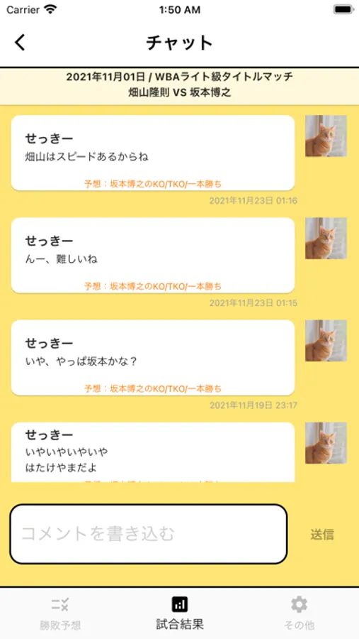 試合専用の掲示板での会話は、的中率の高い人は発言力が増すかも・・・?