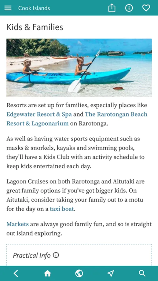 Or, if you have more specific interests, you might dive straight into INTERESTS & ACTIVITIES, the next section of the app. This provides the heads-up on various topics: travelling with KIDS; looking for ART; exploring island HISTORY and CULTURE, including the lowdown on exploring local MARKETS and attending upbeat local church services. Other topics include thorough rundown of the many OUTDOOR ACTIVITIES and a section on WEDDINGS.