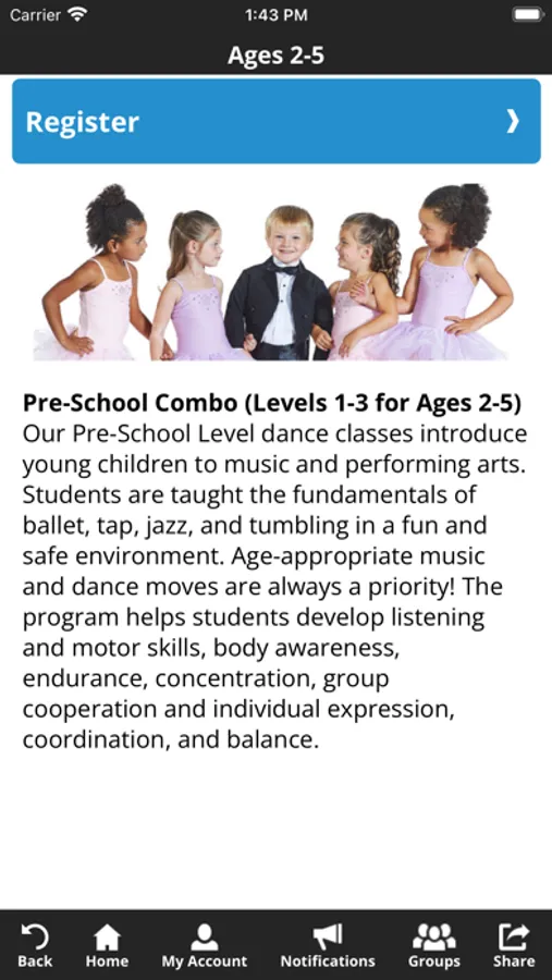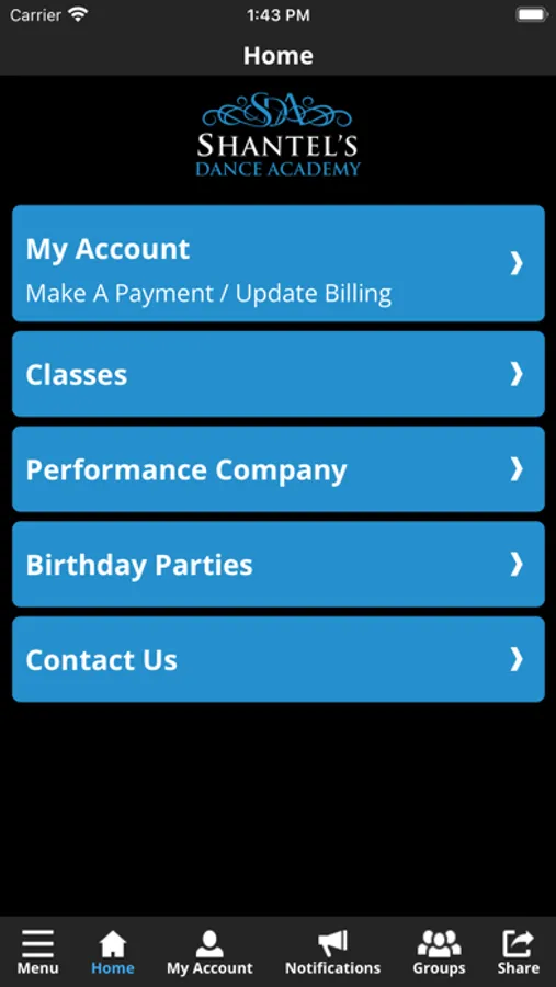 The Shantel's Dance Academy app allows you to manage your account with ease, register for classes, parties, and special events. You'll also receive important notifications about class changes, closings, registration openings, special announcements, and upcoming events.