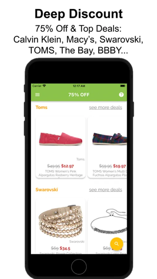 - you easily see & search 75% of discounts & hot deals from many different stores Calvin Klein, Macy’s, Dior, Toms, Bed Bath & Beyond, Swarovski, Estée Lauder,…