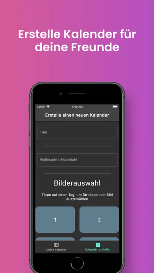 Mit Advent4You kannst du ganz einfach Bild-Adventskalender erstellen. Lade dafür einfach für jeden Tag ein Foto hoch, wähle einen Hintergrund und eine Tür und schon kannst du den Kalender an deine Freunde teilen.