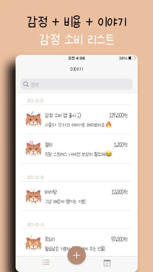 중앙 하단에 있는 + 버튼을 누르고 이야기를 기록해봐요.