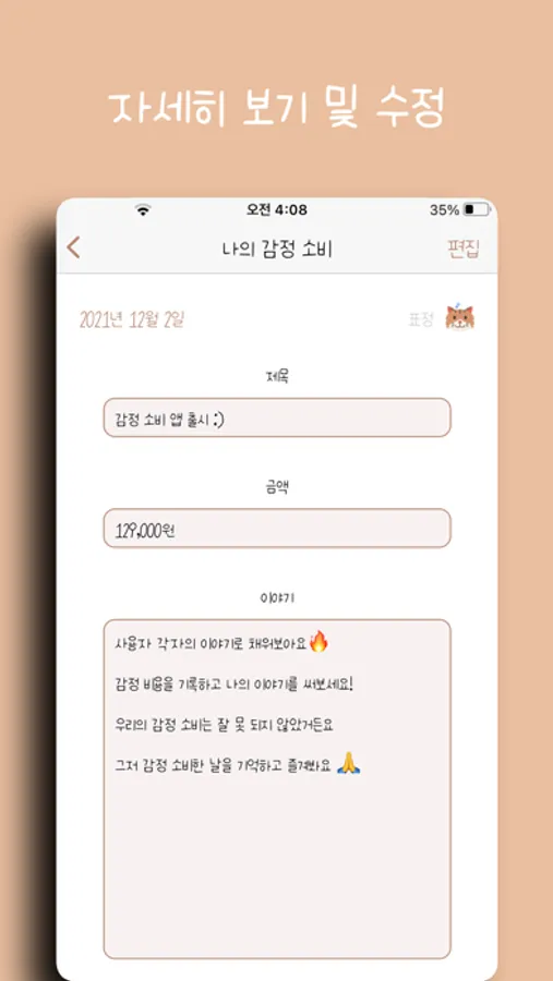 또 이야기를 누르면 기록을 자세히 볼 수도 있고 수정할 수 있죠!
