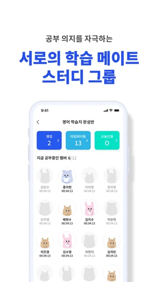 스터디원들이 현재 공부중인지 알 수 있고, 오늘 타이머를 이용하거나 강의를 들은 공부기록은 스터디>타임테이블에서 보며 학습관리를 할 수 있습니다.