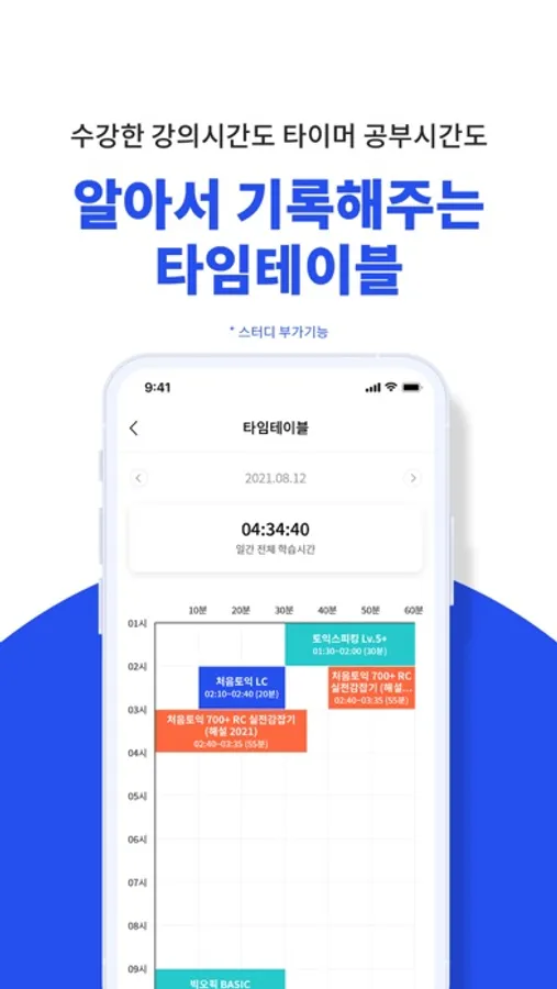 -설정한 목표 기간동안 매일 타이머로 자습시간을 측정하고, 연동한 강의 시간까지 자동으로 측정됩니다. 하루동안 공부한 시간과 강의수강시간을 타임라인으로 볼 수 있습니다. (휴식 시간 제외)