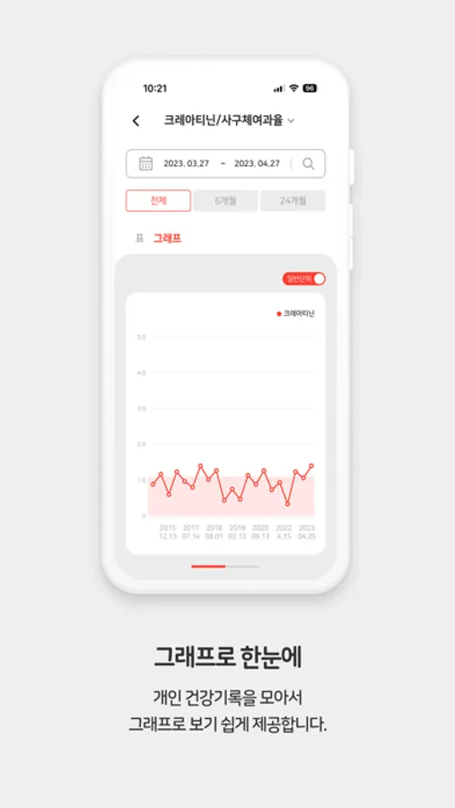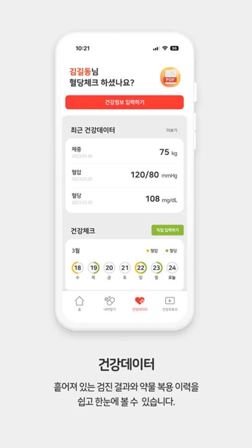 혈압과 혈당 기록, 국가건강검진 결과, 병원 검사결과를 나만의 건강차트로 만들어 건강 관리와 진료에 간편하게 활용하세요.