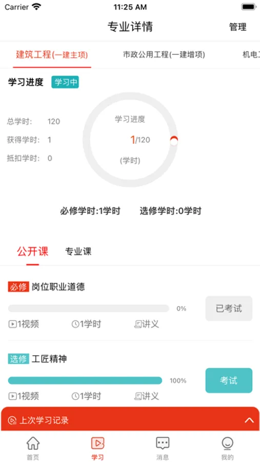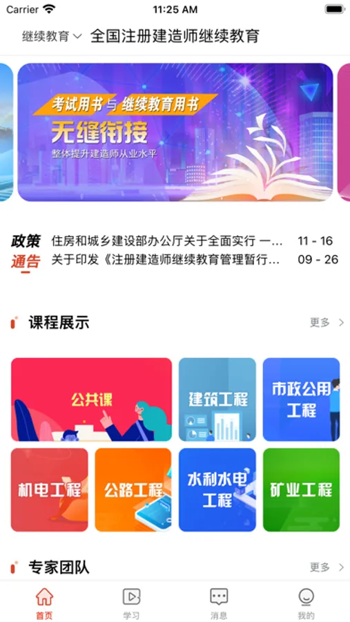 课程分为公共课、建筑工程、市政公用工程、机电工程、公路工程、水利水电工程、矿业工程、铁路工程、民航机场工程、港口与航道工程、通信与广电工程等十一个科目,共计1000个课时,满足每个注册周期120学时继续教育学习的需求。