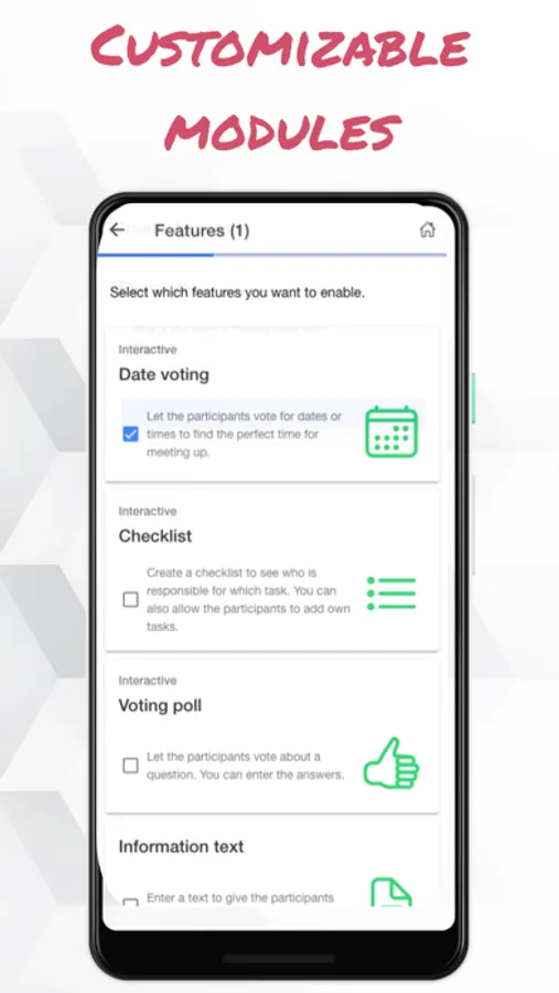 You can create an individual event page with many different modules, like date voting, checklists, maps, generic voting and much more.