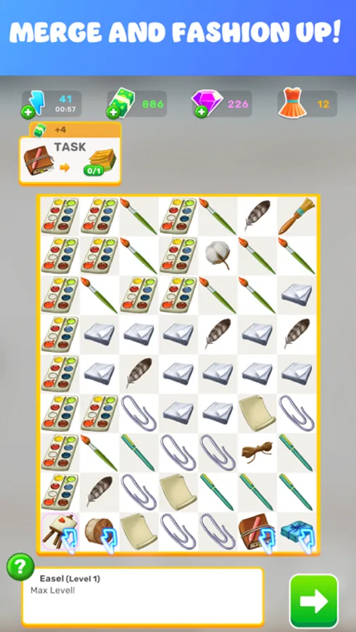 Merge items very quickly, complete the task and get the dresses. Be careful on your energy, make as much as dress pass the level!