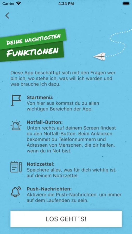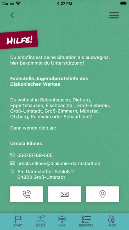 Notfall? Klicke den Notfall-Knopf, um wichtige Adressen und Telefonnummern von Menschen ganz in deiner Nähe zu erhalten, die dir helfen, wenn du in Not bist.