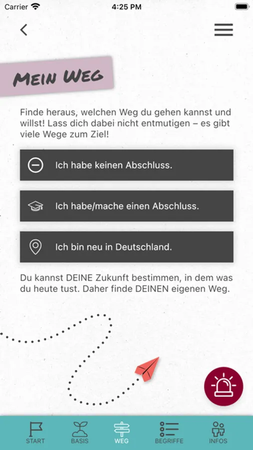 Die App Schule - Was dann? begleitet dich auf deinem Weg von der Schule in den Beruf. Sie beschäftigt sich mit den Fragen wer bin ich, wo stehe ich, was will ich werden und was brauche ich dazu - finde DEINEN Weg mit der App.