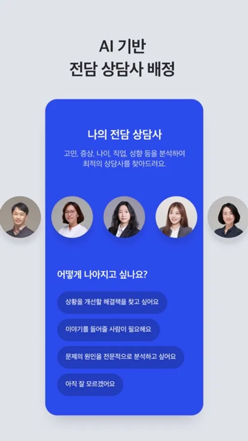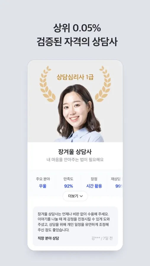 - 나의 상황과 고민에 따라 가장 적합한 상담사를 추천받을 수 있어요.