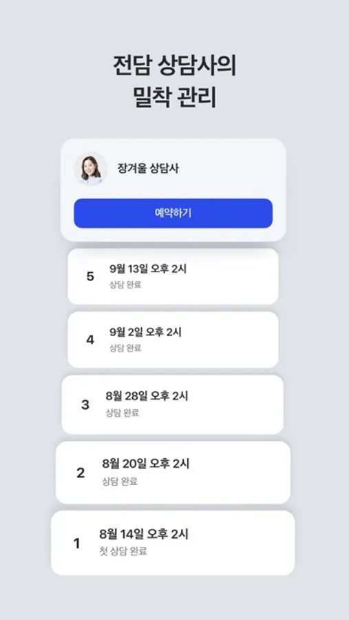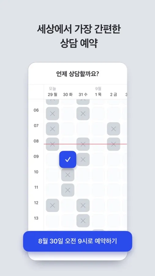 - 번거롭게 전화나 문자로 일정 조율하지 않아도 돼요. 앱 내에서 원하는 상담 일정을 선택하세요.
