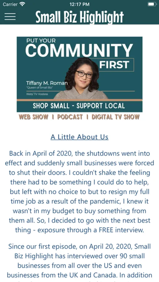 Welcome to Small Biz Highlight! My name is Tiffany Roman and I started this business in 2020 to help small businesses out during those tough times, and it only grew from there! It quickly became the center of a small business movement and the Small Biz Highlight show was born.