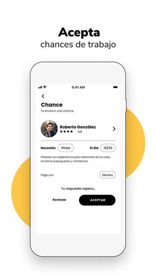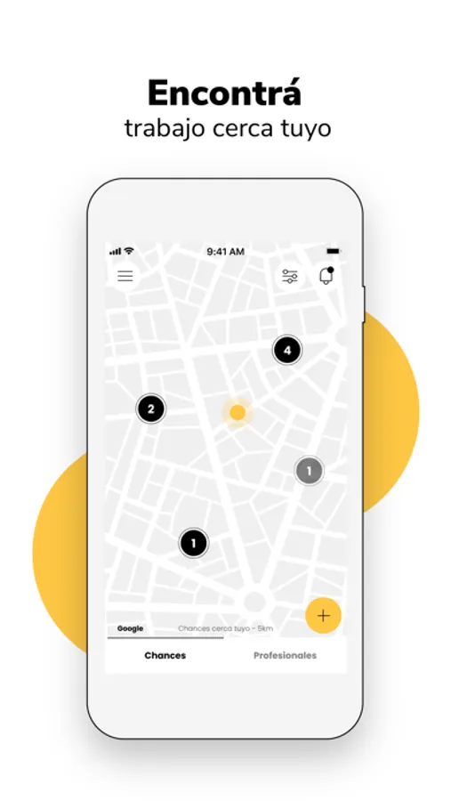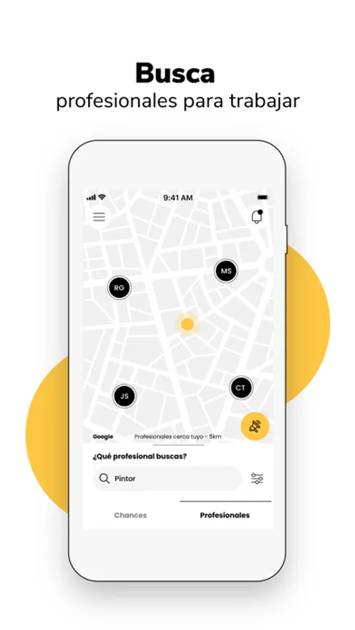 Abre la app, busca el rubro y verás en el mapa los profesionales que estén cerca de tu ubicación. Envía una Chance, habla con profesionales, solicita presupuesto, compara y contrata los servicios de manera fácil, segura y sin intermediarios.