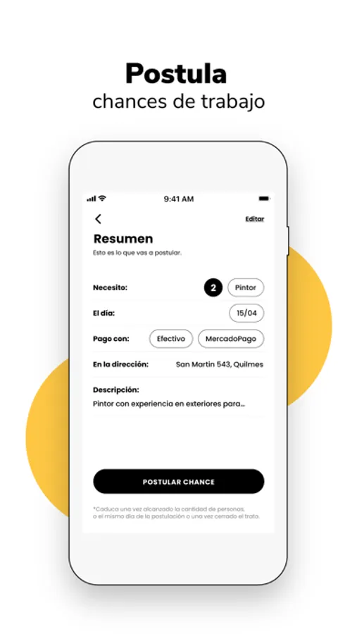 5.Además: Recibí ofertas laborales en Chances y postulate a nuevos trabajos. También podes ofrecer empleo en segundos y visualizar tus postulados, revisar sus perfiles y calificaciones, para aceptar al adecuado para la tarea.